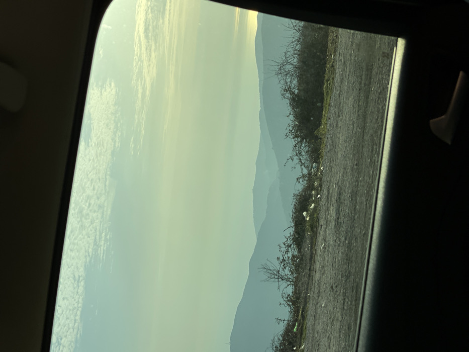 The image depicts a panoramic view of a mountainous landscape in Stanišići, Montenegro, observed from the interior of a vehicle through a side window. The sky occupies the upper half of the frame, showing a gradient from light blue-green at the top to a soft yellow hue towards the horizon on the right, with scattered, small, white clouds present. Multiple layers of mountains recede into the distance across the middle ground, appearing in progressively lighter shades of blue-grey due to atmospheric haze. A communications tower or similar structure is faintly visible on the peak of the leftmost mountain. On the far right horizon, a bright glint indicates sunlight reflecting off a body of water, consistent with the Adriatic Sea. The immediate foreground shows a dirt or gravel slope ascending towards the left, covered with sparse dry, thorny bushes and some patches of green grass. Numerous pieces of white and light-colored plastic litter, including bags and bottles, are visibly scattered amongst the vegetation and on the ground of this slope. The bottom portion of the image shows the dark interior door frame and a light-colored door handle of the viewing vehicle. No individuals are present in the observable external scene.