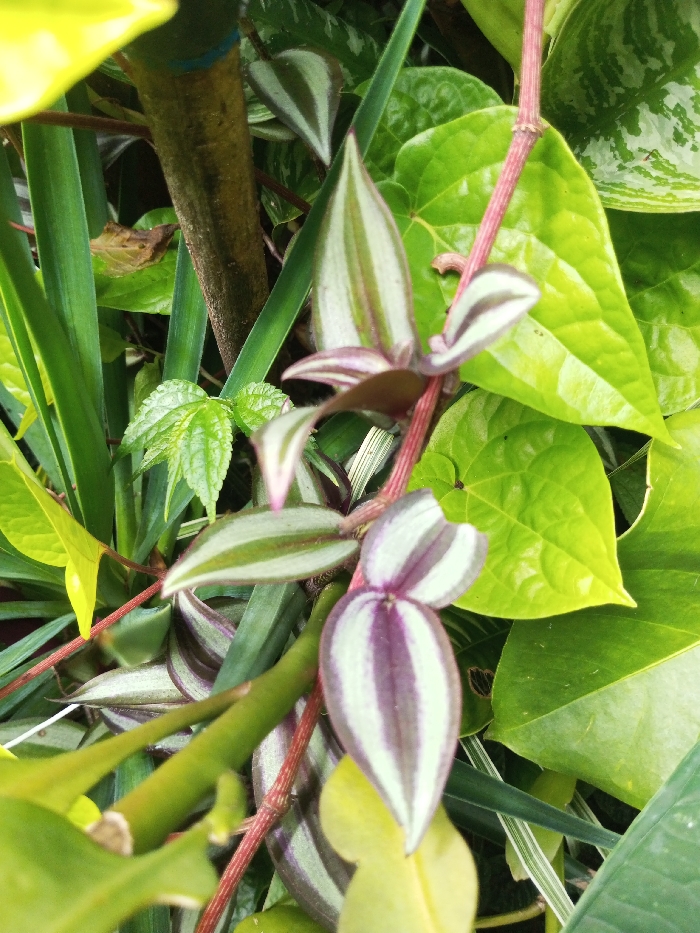 An eye-level close-up photograph captures a dense arrangement of various tropical plants, characteristic of a garden setting in Ciherang, Indonesia. The primary subject is a *Tradescantia zebrina* plant, prominently displayed with multiple leaves and sections of its thin, reddish-purple stems. Its leaves exhibit distinctive parallel stripes of silver-white and dark purple-green, with a lanceolate shape and pointed tips. Surrounding this plant are several other types of foliage: large, glossy, heart-shaped or ovate leaves in bright to yellowish-green hues, some displaying subtle mottling; long, slender, dark green, blade-like leaves positioned vertically; and a cluster of smaller, serrated, light green leaves with a crinkled texture. A light brown, textured vertical tree trunk or thick woody stem is partially visible in the upper-left background. The scene is illuminated by diffused natural light, resulting in soft contrasts and vibrant green and purple tones.