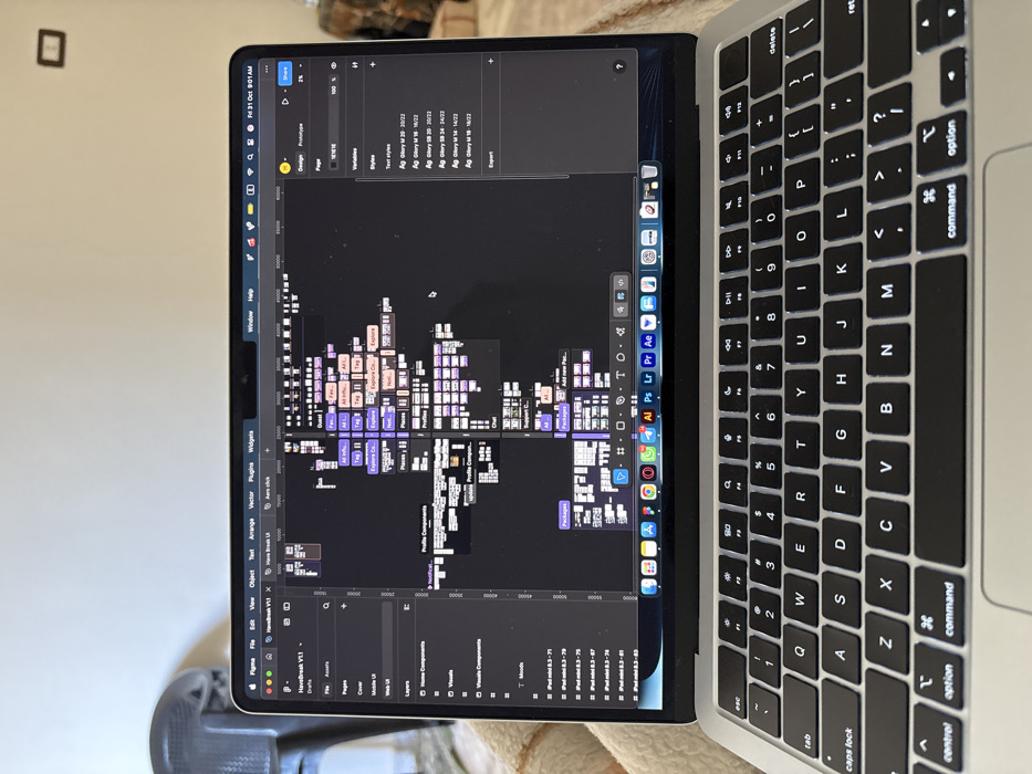 A silver MacBook laptop is centrally positioned, displaying a dark-themed user interface for the Figma design software, specifically for a project titled "HaveBreak V1