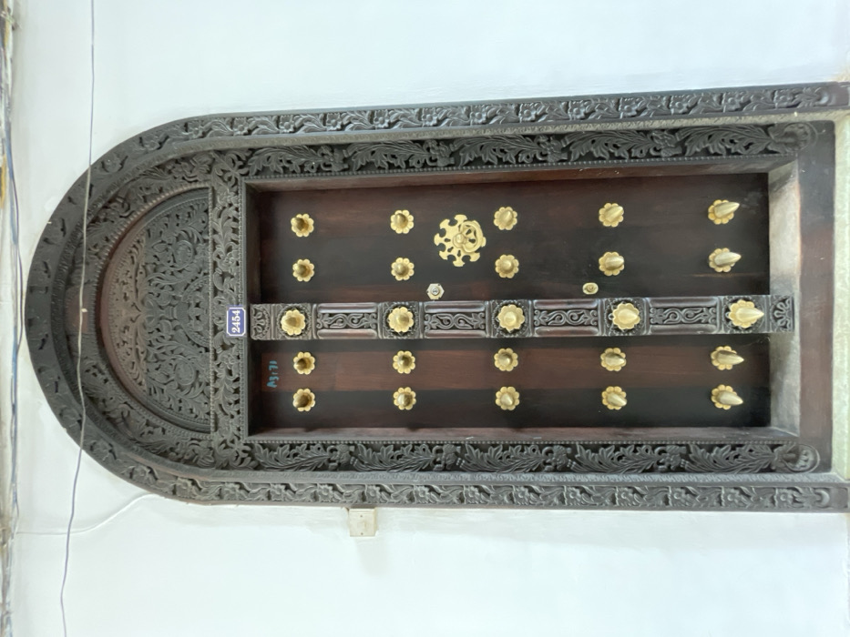 A dark, intricately carved wooden door stands out against a plain white wall. The door frame is adorned with detailed leaf-like patterns. The left side of the door features a semi-circular design filled with elaborate floral carvings. The door itself is a dark brown color, embellished with ornate gold flower-shaped studs and two horizontal bars with alternating gold floral and rectangular patterns. A small rectangular tag is visible on the left side of the door.