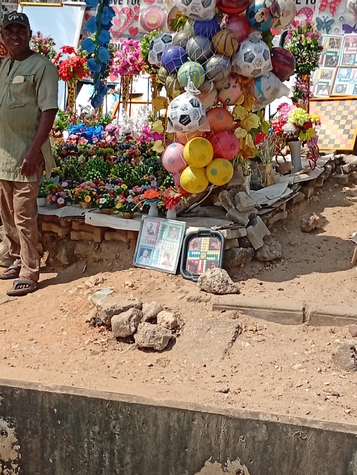An outdoor market scene in Lokoja, Nigeria, features a street vendor and his merchandise display under bright daylight. A light-skinned adult male, wearing a light green short-sleeved tunic, light brown trousers, and dark brown sandals, stands on the left side of the frame, looking towards the viewer. He wears a dark cap. The elevated display stall, constructed from rough stone or concrete blocks, is densely packed with a variety of goods. The primary merchandise includes numerous colorful artificial flowers in bouquets and arrangements, displaying hues of red, pink, blue, yellow, purple, white, and green. Above the flowers, a large cluster of inflatable balls is suspended, many contained within nets. These balls include footballs (soccer balls) with traditional black and white patterns, plain white, and various solid colors, alongside other brightly colored spherical balls (yellow, pink, blue, orange). Promotional signage with "LOVE YOU" text and heart motifs, as well as butterfly decals, is visible on the back panel of the stall. To the far right, a surface with a black and white checkerboard pattern is partially visible. On the unpaved reddish-brown dirt ground directly in front of the stall, two framed boards are laid out; one appears to be a Ludo game board. The ground surface is uneven, with scattered small rocks and debris. A low, dark grey concrete or stone barrier runs horizontally across the bottom of the image, indicating a structural edge. The scene is brightly illuminated, casting shadows indicative of direct sunlight.
