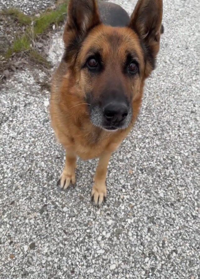 A German Shepherd stands on an asphalt surface