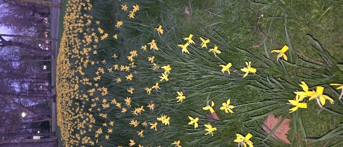 The image displays a scene within Julianapark, Venlo, Netherlands, during twilight hours. The primary subject is a dense field of blooming yellow daffodils (Narcissus) with green foliage, covering a grassy lawn. Thousands of individual daffodil plants are scattered across the foreground, midground, and background, creating a broad carpet of yellow. In the background, numerous tall, mature deciduous trees with bare branches stand silhouetted against a purple-blue sky. Several functional streetlights are visible among these trees, emitting artificial light. Faintly discernible structures, likely buildings, are visible in the far distance through the tree line. No individuals, animals, or ongoing actions are present. A single dry, reddish-brown leaf is observed on the grass in the lower left quadrant of the frame. The overall lighting is a blend of natural ambient twilight and artificial illumination.