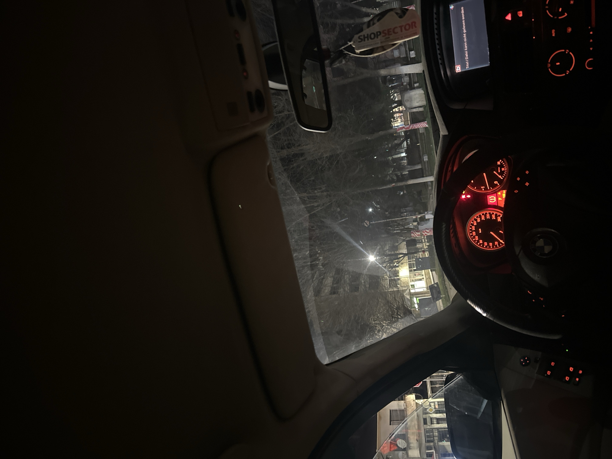 The image depicts the interior of a stationary vehicle at night, observed from the driver's seat