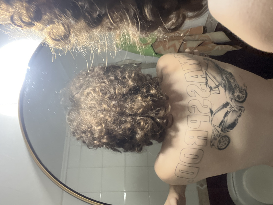 A reflection in a circular mirror displays a person with curly brown hair. The person's back is turned to the viewer, revealing a detailed tattoo of a motorcycle alongside the reversed text "BOB&22A". The background features white tiles, possibly in a bathroom setting. Part of another person's head and hair is visible at the top of the frame, possibly indicating they are taking the photo. A toilet bowl is visible on the lower right.