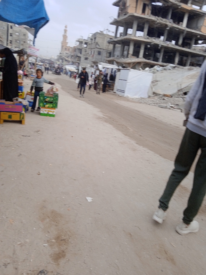 The image displays a street scene in the city of Khan Yunis, Palestinian Territory, characterized by extensive urban destruction under an overcast sky. In the immediate foreground, the lower half of a person wearing dark pants and white sneakers is visible, walking away from the camera on a dusty, unpaved road. On the left side of the mid-ground, a makeshift market stall is positioned under a blue tarp. A person clad in a black abaya stands behind an arrangement of produce, including fruits displayed in colorful wooden crates, one visibly labeled "Avocado." A child, wearing a light grey long-sleeved shirt and dark pants, stands adjacent to the stall, reaching towards the displayed items. The central dirt road extends into the distance, populated by multiple individuals walking. Among them, one person in dark civilian clothing walks toward the camera, and further back, at least one individual in camouflage attire, possibly carrying equipment, is visible. To the right of the road, substantial piles of concrete rubble and debris indicate severely damaged or destroyed structures. Several white, temporary tent-like shelters are erected amidst the wreckage. The background features numerous severely damaged multi-story concrete buildings, many reduced to skeletal frames with visible rebar and missing walls. A distinctive, light brown mosque minaret with multiple balconies rises prominently in the center-left background, standing amidst the widespread devastation, confirming a central urban setting.