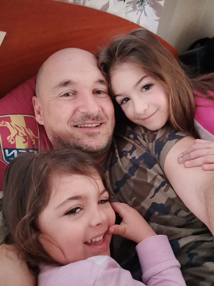 A close-up, indoor photograph, reportedly taken in Obrochishte, Bulgaria, features three individuals. Centered and slightly to the left is an adult male with a bald head and light facial stubble, smiling directly at the camera. He is wearing a dark garment, with a red pillow or fabric visible behind his left shoulder, displaying a yellow and red crest featuring a feline-like creature, resembling the Genoa C.F.C. emblem. To the man's right, a young female with long brown hair rests her head against his shoulder, smiling subtly towards the camera. She is dressed in a camouflage-patterned t-shirt, and her right arm is visible, draped over the man's arm. Below and slightly to the left of the man, another young female with brown hair is visible, laughing or smiling broadly, with her mouth open. She looks slightly away from the camera and wears a light purple long-sleeved top. Her left hand is positioned near her chin. The subjects are in close proximity, suggesting an intimate interaction. The background is softly blurred, showing an orange-brown surface on the left, possibly a headboard or furniture, and a lighter, faintly patterned fabric in the upper right.