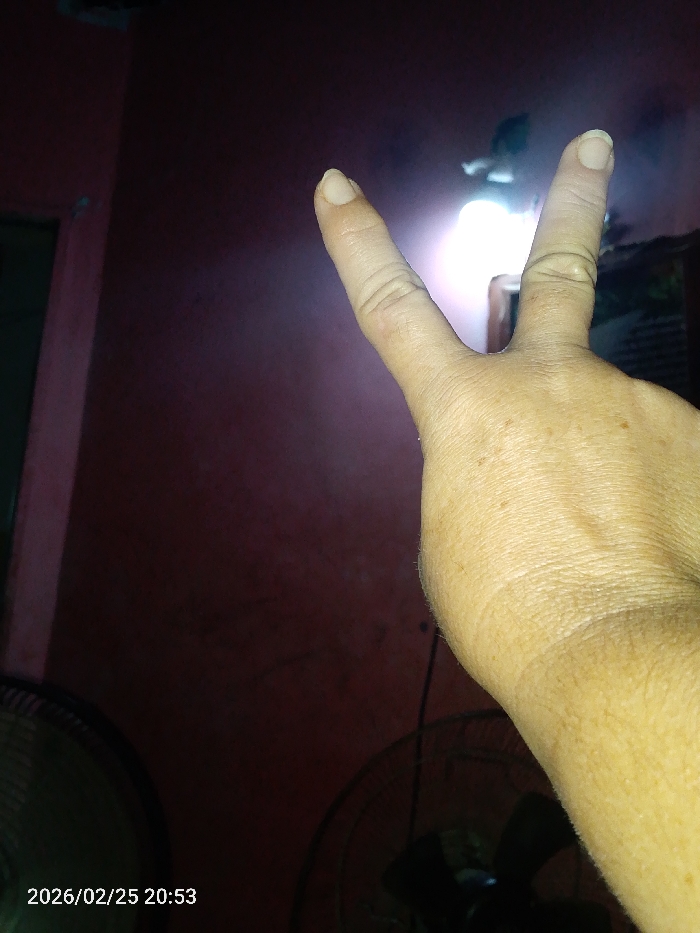 The image displays a close-up of a human right hand, oriented with the palm facing away from the camera, performing a "peace sign" or "V-sign" with the index and middle fingers extended upwards. The skin tone is light to medium brown with visible freckles or pigmentation on the back of the hand. Fingernails are natural. The background is dimly lit, revealing a dark red-brown wall. A strong, bright light source, possibly an exposed bulb, is centered behind the hand, casting a significant flare and illuminating the immediate area. Partial views of two circular objects, consistent with electric fans, are visible in the lower left and lower right corners of the frame. The scene is indoors, in a room, at an unknown address in the city of Unknown, Unknown. A digital timestamp in the lower left corner reads "2026/02/25 20:53."