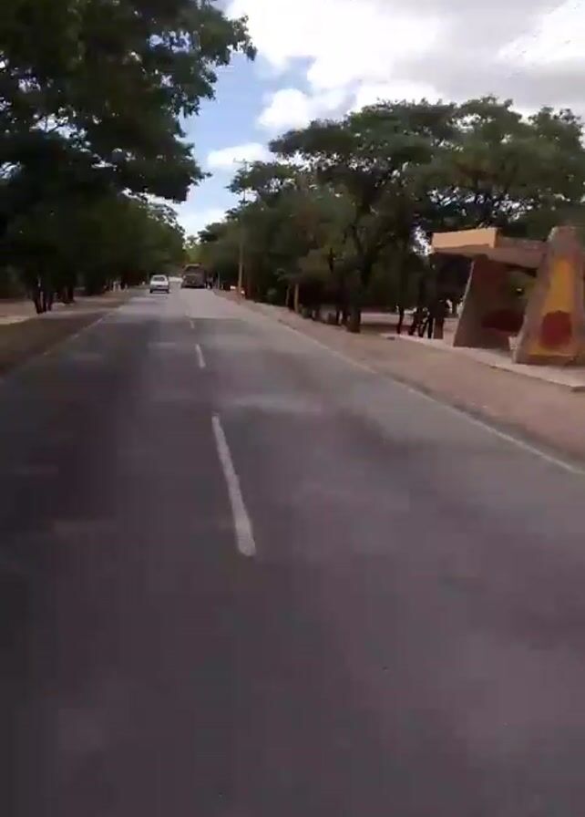 road lined with trees on a sunny day. The camera appears to be moving, capturing the view from a vehicle driving along the road. There is a white center line on the road. In the distance, there are a couple of vehicles driving in the same direction. On the side of the road, there's a sandy area with trees. A pole is visible with yellow paint on the lower part. Beyond the trees, a playground or open area with structures is visible. The sky is partly cloudy. The video is labeled "Infinix SMART 8".