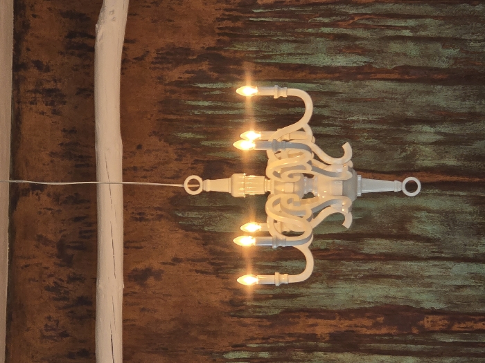 - "A white, six-light chandelier hangs centrally in an interior space in Plovdiv, Bulgaria" by FM-s2ZLx2, licensed under CC BY 4.0