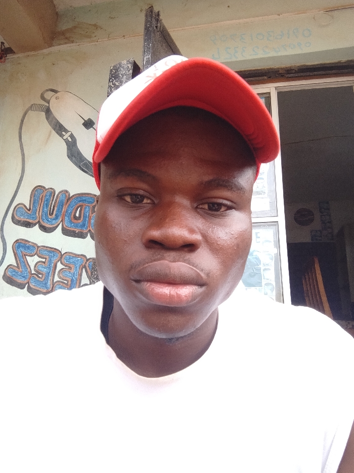 A young man with dark skin wears a white t-shirt and a red-brimmed white cap. He faces the camera directly. Behind him, there's a wall with a barber shop advertisement featuring a drawn electric razor and stylized blue lettering. A window with a partial view of an interior space is visible on the right. The overall lighting is soft, highlighting the man's facial features.