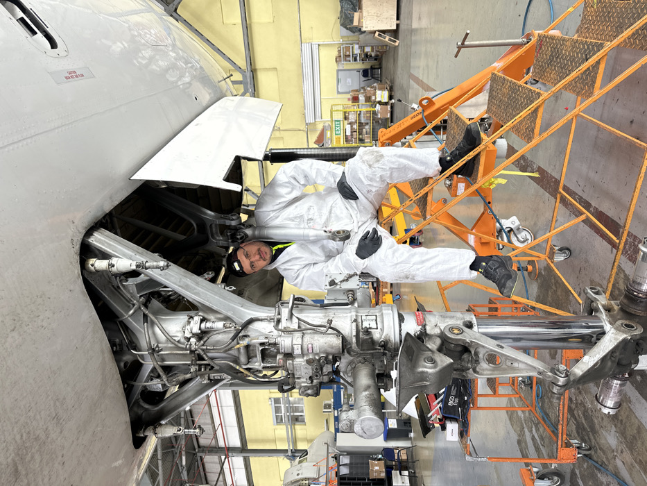 - "A male aircraft technician is seated on an orange mobile work platform next to the partially disassembled main landing gear of a large aircraft inside a maintenance hangar in Aksakovo, Bulgaria" by FM-Nojfz2, licensed under CC BY 4.0