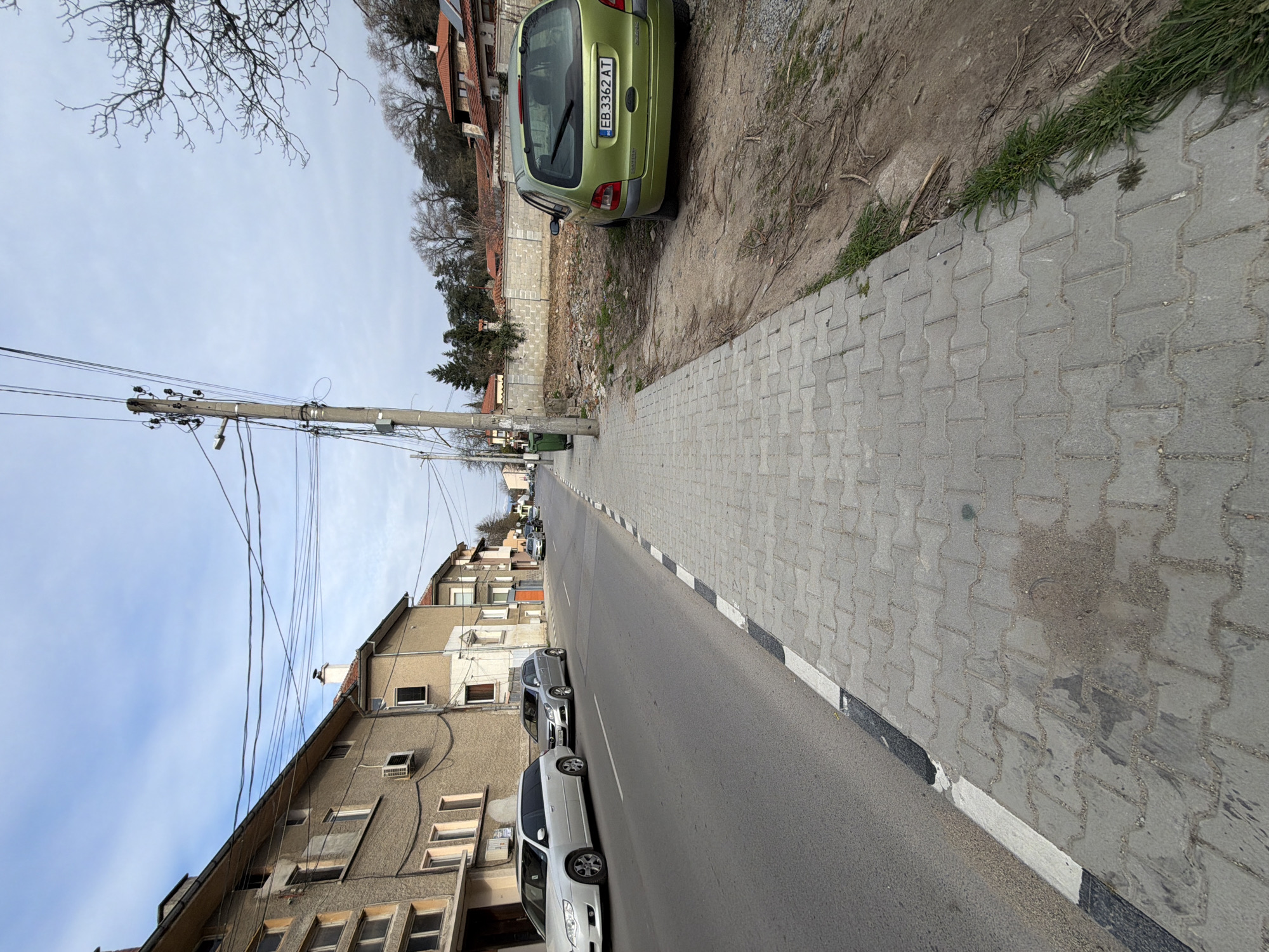 The image depicts a street scene in what is likely Kazanlak, Bulgaria, given the license plate on the green vehicle (EB 3362 AT). The street is narrow and appears to be residential, with buildings lining the left side. Several parked cars are visible on the left side of the road. A sidewalk, paved with gray interlocking pavers, runs along the right side of the street. A green Renault Scenic is parked on the right, adjacent to an unpaved area with some vegetation. Overhead, utility poles and wires span the street. The sky is overcast.