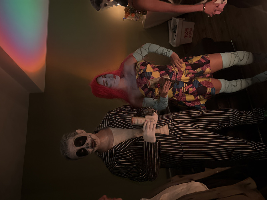 In Zibatá, Mexico, an indoor social gathering features three individuals in costume. A central figure, dressed as Jack Skellington, stands facing forward with white skull-like face paint, black eye sockets, and a stitched mouth, complemented by gray hair. This individual wears a black and white pinstripe suit with white gloves and holds a silver beverage can in the right hand. To their right, a second central figure, costumed as Sally, stands with light blue skin makeup, red hair, and stitched facial markings. This person wears a multicolored patchwork strapless dress, light blue arm sleeves, and matching thigh-high stockings, holding a brown bottle/can in the right hand with the left hand on their hip. A third individual, partially visible on the far right, also has skull-like face paint and holds a white object. The background consists of dark green walls and a dark wooden floor. A rainbow-colored light projection illuminates the upper right wall/ceiling. To the right, a dark sofa is visible, along with a white plastic bin bearing a red "OXXO" logo. Further right, a surface holds clear bottles and a small floral arrangement with yellow and orange flowers, illuminated by a warm light source. The scene is dimly lit.