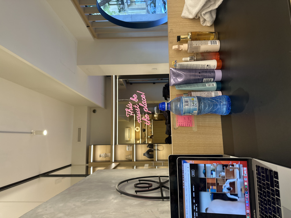 The scene depicts the interior of a modern establishment, specifically identified as a Hot Yoga Madrid studio, likely the Recoletos location at Calle de Recoletos, 10, Madrid, Spain. In the immediate foreground, a silver Apple MacBook Pro laptop is open on a dark, glossy countertop. The laptop screen displays a web browser featuring a webpage from "Hot Yoga Madrid," showing images of individuals in yoga poses, including a person in a backbend. Application icons for Photos, Photoshop, and Spotify are visible on the laptop's dock. To the right of the laptop, on the same countertop, a blue plastic 0.75 L bottle of "AGUA MINERAL NATURAL BAENA" water stands upright. Alongside it, an assortment of personal care products (tubes, bottles, and dispensers) are arranged. A small pink sticky note with handwritten text is affixed to a light wood-paneled partition behind these items. A white folded towel is situated on the far right of the countertop. The midground reveals a brightly lit, minimalist interior. On the left, a textured grey wall features a large, dark circular metal decorative piece or logo frame. Reflected in a prominent mirror in the center-right is a pink neon sign displaying the phrase "This must be the place!". Below the neon sign, wooden shelving units, illuminated by integrated LED strips, hold various decorative white and black ceramic or stone objects. A reception desk or counter is partially visible further back, with dark fabrics or towels stacked nearby. A green exit sign is visible in the background. On the far right, a large round mirror with a blue frame reflects an outdoor urban scene. The reflection shows light-colored building facades typical of European architecture, green foliage from trees, and a street view, consistent with a central Madrid location. The overall environment is clean, well-lit, and functional. No individuals are explicitly present in the physical space depicted.