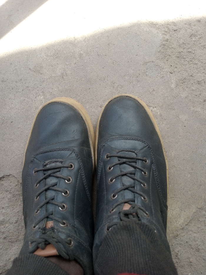 The image, captured from an overhead, first-person perspective, depicts a pair of feet standing on a coarse, light grey concrete or asphalt surface in Sabon Tasha, Nigeria. The feet are clad in dark grey, possibly leather, lace-up shoes with visible metal eyelets and dark laces, featuring light brown/tan rubber soles. Dark grey, ribbed socks cover the ankles and extend into the shoes, with a small portion of red fabric visible above the tongue of the right shoe. The shoes exhibit creasing and scuffing on the uppers, indicative of wear. A distinct diagonal shadow line, resulting from direct sunlight, extends across the upper-left portion of the ground surface.
