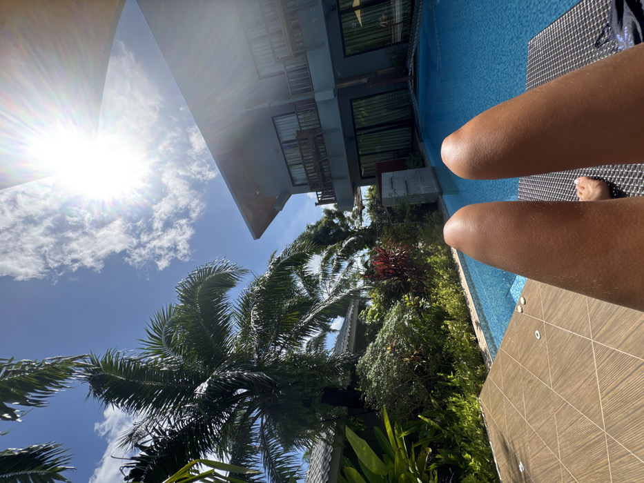 Sunlight streams through a sky with scattered clouds, illuminating palm trees and tropical foliage near a building. A blue pool borders the scene. The tanned legs of a person sitting beside the pool are visible. The surrounding area appears lush, suggesting a tropical vacation setting.