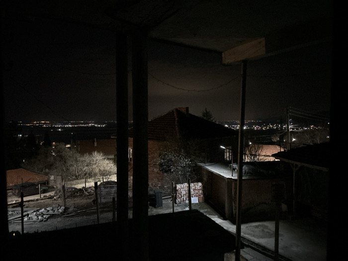 The image presents a nighttime elevated view of a residential area in Simeonovets, Bulgaria