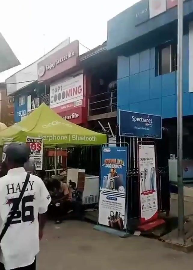 street in an urban area in daylight. The camera moves through a crowded street filled with people walking in various directions. The scene is marked by numerous shops and stalls with awnings on both sides of the street, advertising products and services. Several banners are visible, including one that reads "syms by MOL" and another that says "Enjoy better life." There's a range of stores, including mobile phone shops and what appear to be banking services. The sky is overcast and gray, indicating potentially poor weather.