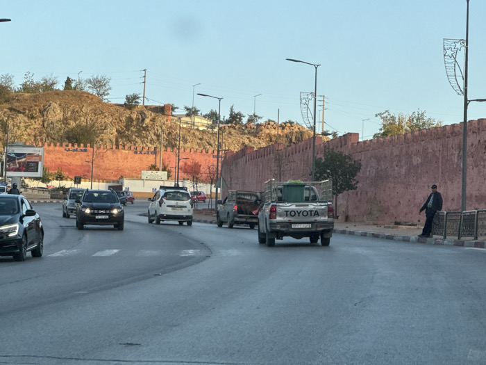 A street scene features several cars on a curved road. A silver Toyota pickup truck with cargo in its bed is visible in the center. A tall, reddish-brown wall with battlements stretches along the roadside. A man in dark clothing leans against a railing near the wall. Lamp posts with decorative elements line the street. A hill with sparse trees and structures is visible behind the wall. The sky is clear and pale blue.