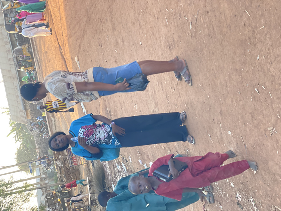 The image depicts an unpaved, reddish-brown dirt road in Muchiya, Nigeria, under warm, bright lighting. Scattered debris is visible on the ground. In the foreground, a young barefoot Black male child, wearing a red short-sleeved tunic and matching trousers, walks left. He carries a dark rectangular electronic device, possibly a laptop, under his left arm. A small white object is visible in his mouth. To his right, a Black female stands, facing slightly forward. She wears a blue t-shirt with a graphic design of a woman's face and leopard print, dark trousers, and light sandals. She holds a clear plastic bottle with a white cap to her mouth with her right hand. A light blue shoulder bag hangs from her left side, and a white bracelet is on her left wrist. To her right, a second Black female stands in profile, facing right. She wears a patterned short-sleeved top, a light blue knee-length denim skirt, and light sandals, holding a dark plastic bag in her left hand. The midground and background show ongoing street activity. To the left, behind the foreground individuals, a wooden structure with a "POS" sign is visible. Several pedestrians are present, including a person in a yellow and black striped shirt walking away, and another in red walking further left. Multiple motorcycles are seen, some in motion. A yellow Keke Napep (auto-rickshaw) is visible on the right. Further right, a group of individuals, some in traditional white robes and brightly colored head coverings, are gathered. Simple buildings and distant trees line the street.