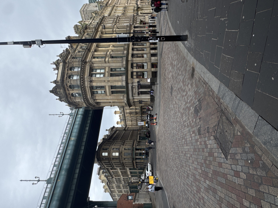 A street view showcases a large, ornate building with detailed architectural features and numerous windows. A bridge structure intersects the scene on the left, contrasting with the classical architecture. People and vehicles populate the street below. The ground is paved with a mix of brick and stone, displaying variations in color and texture. A tall, thin lamppost extends into the sky on the left.