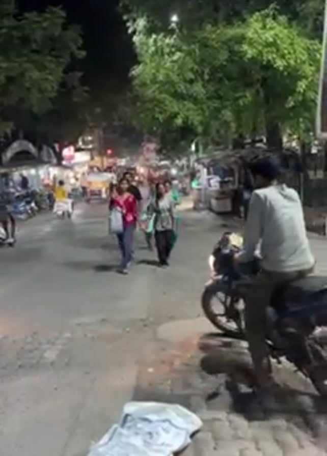 The video depicts a street scene at night. The street is lit by overhead streetlights and the headlights of vehicles. There are several people walking on the street, including a group of three women and a man walking together. They are dressed casually. A man is sitting on a parked motorcycle on the right side of the frame, and another man is standing near the camera on the left. There are also other scooters, motorcycles and rickshaws on the street. Along the sides of the road, there are some small stalls or vendors. The road surface appears to be asphalt or paved. There are trees along both sides of the street, adding to the green foliage under the artificial lighting. A large white bag is sitting on the ground. The scene has a busy, urban feel.