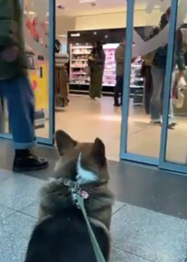 medium-sized corgi dog on a leash, sitting and looking into a brightly lit store with a glass entryway. People are walking in and out of the store. The dog is in the foreground, with its back towards the camera. The store appears to be a cosmetic or personal care store. People in the store are browsing and interacting with the merchandise.