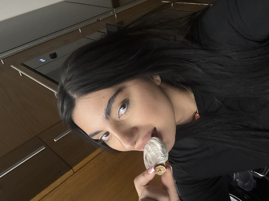 A female subject, appearing to be a young adult with dark hair parted centrally, is depicted indoors within a modern kitchen environment. She is wearing a black long-sleeved top and a gold chain necklace with a small red bead. Her right hand, exhibiting light-colored nail polish on the visible thumb, holds a pale, textured dried fruit, consistent with a dried persimmon, to her partially open mouth. Her eyes are directed towards the camera. The background consists of kitchen cabinetry; light wood-toned cabinets with horizontal metallic handles are visible on the left, while lighter-toned cabinets with similar handles and a built-in oven or microwave featuring a digital display (showing indistinct numbers) are visible on the right. The specific location within the city of Yerevan, Armenia, is not discernible from visual elements in the image.