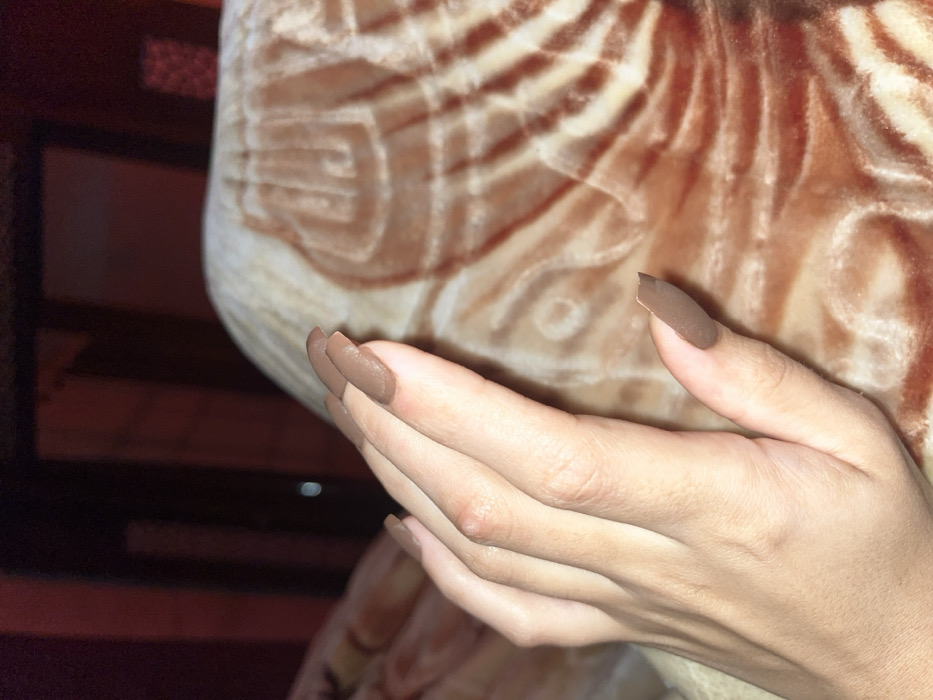 A hand, with long, almond-shaped nails painted a matte brown, is shown resting against a brown and tan patterned blanket