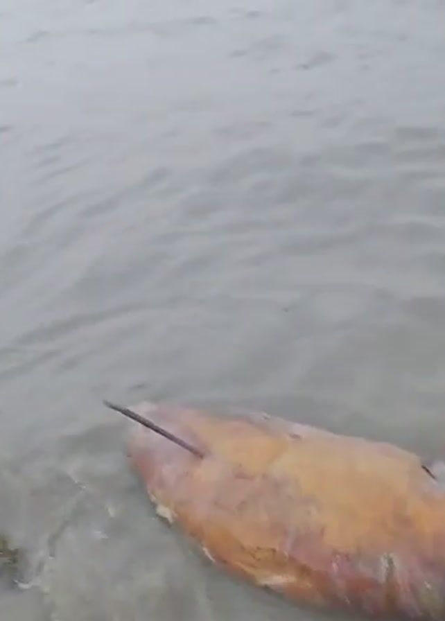 dead dolphin on a muddy beach, close to the waterline. The dolphin is orange-brown in color and appears bloated. The camera pans to the right to show a coastline with a group of people gathered in the distance. The beach is littered with trash. The water is gray and choppy. The sky is overcast.