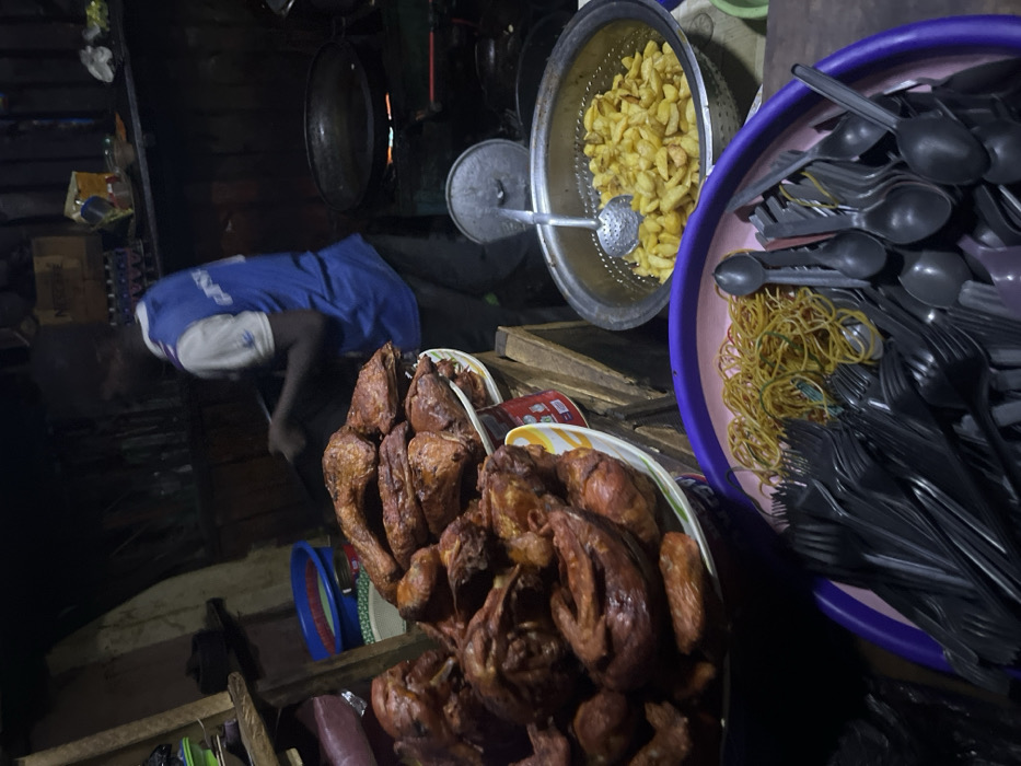 A man wearing a blue shirt is crouched, apparently working in a dimly lit outdoor kitchen area. There are plates piled with fried chicken, a bowl of fried potatoes, and a container filled with black plastic silverware and rubber bands. The surrounding area seems cluttered with cooking utensils and supplies, suggesting a busy food preparation environment.