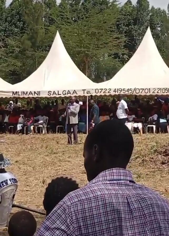 The video depicts an outdoor gathering, possibly a funeral or memorial service, with attendees seated under large white tents. A man stands in front, speaking into a microphone. The camera focuses on a person in the foreground, wearing a plaid shirt, their back to the viewer. The event appears to be taking place in a grassy field, surrounded by trees. The tent is labeled "MLIMANI SALGAA" along with a phone number. People are seated in rows of chairs, listening to the speaker. The general atmosphere seems somber and respectful.