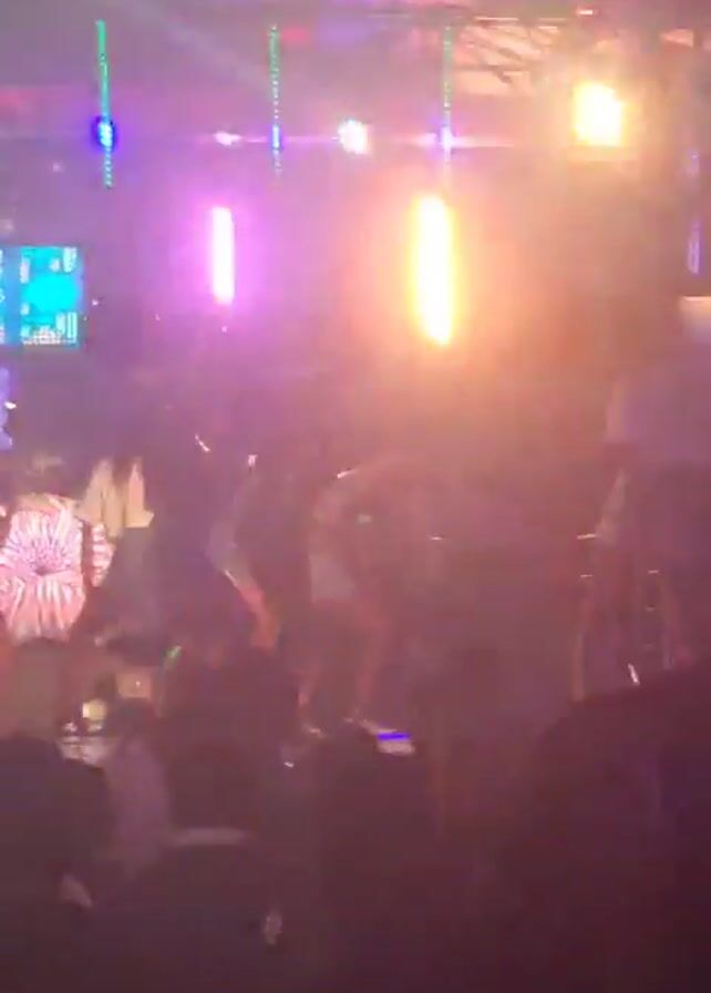 crowded indoor space illuminated by flashing purple and blue lights. Silhouettes of people are visible in the foreground, suggesting a dance floor or concert venue. The lights create an energetic and chaotic atmosphere, typical of a nightclub or music event.