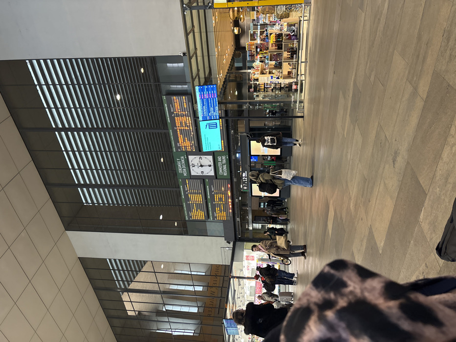 This image depicts the interior of the main concourse at Santa Justa train station in Seville, Spain. The scene is observed from a low angle, with the upper back and shoulder of a person wearing a brown and black leopard-print jacket partially visible in the lower-left foreground. A dark bag rests on the floor in front of this individual. The environment is a large, modern, and brightly lit space with a high ceiling featuring square acoustic panels. Large glass curtain walls dominate the upper sections of the background, reflecting interior light and exterior structures. The right glass wall includes horizontal louvered blinds. The floor is covered with large rectangular tiles in varying shades of light brown, resembling wood planks. Prominently displayed above the entrance/exit gates are several digital information screens. Two large, dark screens on the left and center display train schedules under the headings "CERCANÍAS Y MEDIA DISTANCIA" (Commuter and Medium Distance) and "COMMUTER AND REGIONAL TRAINS" in white and orange text. A large analog clock with a black face, white numbers, and white hands showing approximately 12:40 is centered between these schedule boards. To its right, a bright blue digital screen displays a white trash bin icon and text, likely indicating a service message or malfunction. Below the information screens, a series of darker entrance/exit points lead to the train platforms, with an illuminated sign above one indicating "7-12 Vías" (Tracks 7-12). To the far right, a retail kiosk with glass walls is brightly lit, showcasing shelves filled with various packaged goods, bottles, and merchandise. To the far left, another retail area is partially visible, with a reflected sign showing part of "JOHNIE WALKER". Approximately fifteen to twenty individuals are present in the concourse, engaged in various activities. In the mid-ground, a woman with light-colored hair, wearing a dark top, light blue wide-leg jeans, and a backpack, stands facing left, holding a light-colored tote bag. Further right, another person walks away from the viewer, wearing a dark top and light pants, carrying a backpack. Near the center-left, a man in a light brown coat and a pink scarf stands, holding a small foldable bicycle. Other individuals are scattered throughout the concourse, some with luggage, walking towards or away from the platform entrances, or standing. No direct interactions between individuals are clearly discernible.