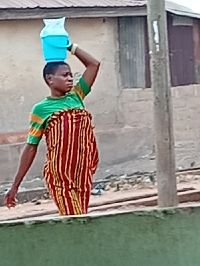 A lone female is depicted in the city of Gboko, Nigeria, walking from right to left across the frame. She carries a light blue plastic bucket, containing a white plastic bag or cloth, balanced on her head. Her left arm is raised, with her hand near the bucket, appearing to steady it. She wears a green and yellow striped short-sleeved top and a red and yellow striped wrapper or skirt. A gold-colored bangle is visible on her left wrist. She looks towards her right. In the background, two single-story structures with unpainted cement block or adobe walls and brown/red corrugated metal roofs are visible. The building to the left features a corrugated metal window or door. A light-colored utility pole stands vertically to the right of the female. The immediate foreground shows a green-painted wall or barrier, obscuring the lower portion of the female's body. The ground beyond the foreground wall appears to be an unpaved dirt or gravel path, with some debris visible.