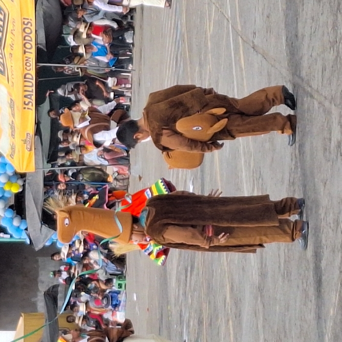 The image depicts an outdoor cultural event on a grey paved surface in José Luis Bustamante y Rivero, Peru. In the immediate foreground, two children are featured in brown, full-body animal-themed costumes. The child on the left wears a tall, light brown llama-head hat with cartoonish eyes and a light blue band, and a brown coat-like garment. The child on the right is viewed from the back, wearing a similar brown costume with a medium brown plush animal, resembling a rodent or small camelid, attached to its back; its head is bowed. In the midground, additional performers are visible, including an individual in a red skirt with colorful horizontal stripes, and an adult male in a white shirt, brown vest, and light brown hat. A crowd of spectators, many wearing hats, occupies chairs or benches behind the performance area. The background contains a prominent yellow canopy tent on the right displaying "¡SALUD CON TODOS!" (Health with everyone!) in red text. A darker tarp canopy extends leftward behind it. A blue and yellow balloon arch is visible in the upper left background, and a grey concrete wall or building constitutes the furthest backdrop. The ground is a flat, unadorned paved area.