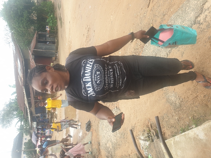 A full-frame photograph depicts an unpaved street scene in Aba, Nigeria, under daylight conditions. The central figure is a woman, appearing to be in her 30s or 40s, with dark skin and braided hair, walking forward and slightly to the viewer's left. She wears a black t-shirt emblazoned with the "JACK DANIEL'S Old No. 7 BRAND TENNESSEE SOUR MASH WHISKEY" logo, black skinny jeans, and dark flip-flops with red-painted toenails. She carries a dark backpack and holds a black smartphone in her left hand. Her right hand holds a light blue reusable shopping bag containing a pink item and a black rectangular object. Her mouth is slightly open. In the mid-ground and background, several other individuals are present. To the left, a woman in a light-colored dress is visible, alongside a young child in a pink dress and another child in a yellow shirt and blue shorts. To the right, two young individuals, one in a yellow shirt and blue shorts, and another in a yellow shirt and light-colored skirt, are walking. The ground is an unpaved dirt surface with multiple puddles of water. The background features various structures and vegetation. On the left, partially obscured market stalls with umbrellas and a building with a white facade and dark roof are visible. On the right, multiple small, makeshift structures with corrugated metal roofs and walls, likely commercial, are present, backed by lush green foliage. Dark pipes run along the ground in the bottom-left foreground.