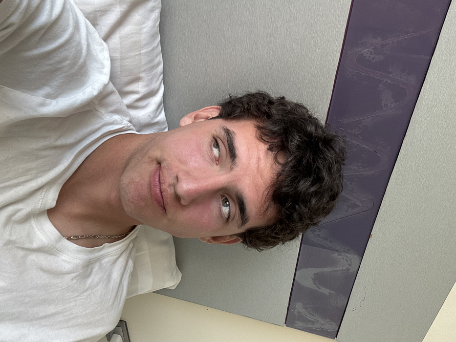 A young man with curly dark hair is lying on his left side, wearing a white t-shirt and a silver chain. He's looking directly at the camera with a slight smile. The background consists of a white pillow and a wall with a dark purple stripe. The wall is otherwise light grey or white. The photo seems to be taken from an upward angle.