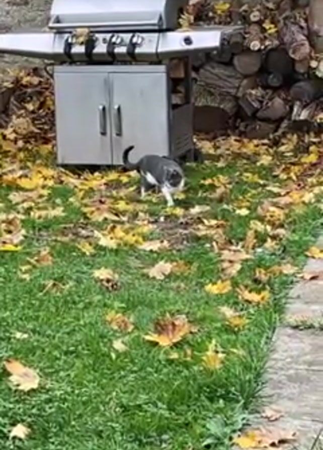 The video depicts a grey and white cat walking across a grassy lawn covered with fallen yellow leaves. In the background stands a stainless-steel grill next to a stack of firewood against a stone wall. The cat pauses briefly to sniff at the leaves.
