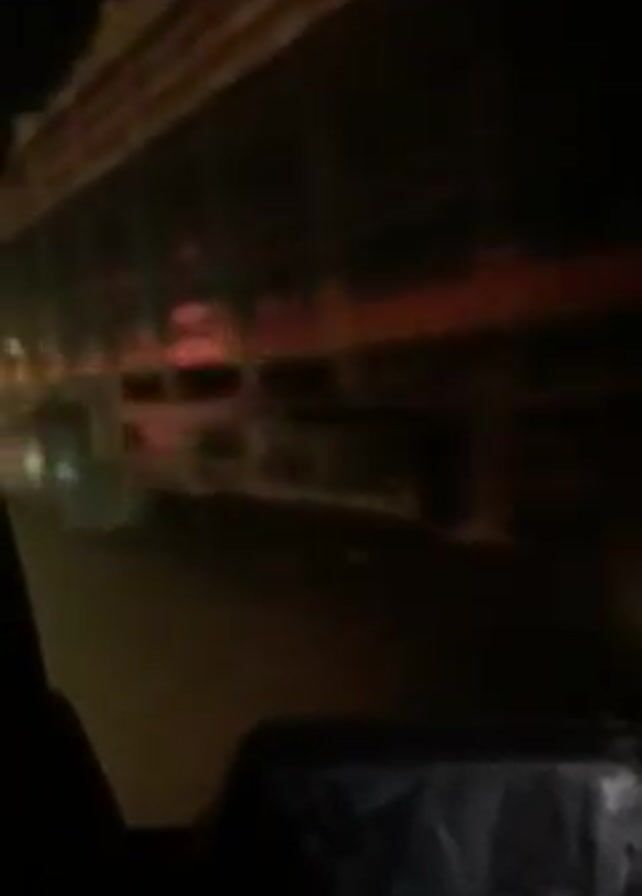 A vehicle is traveling down a dark street, passing several large trucks parked on the side of the road. The trucks are predominantly green and yellow. Streetlights and headlights are visible in the distance. The perspective is from inside the moving vehicle.