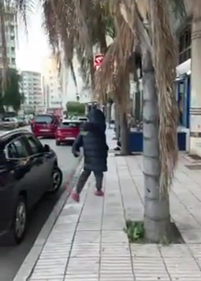 A young person wearing a dark hooded puffer jacket and red sneakers is walking along a sidewalk in a city. The person stops, looks at the camera, and appears to say something. There are palm trees along the sidewalk, parked cars, and buildings. The street is relatively empty, with a few cars driving by. The camera is at a slight angle, looking down the street. Sirens are heard in the background.