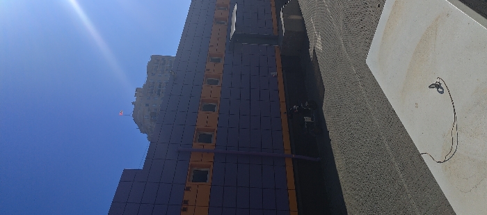 - "The image depicts an outdoor urban scene under a clear blue sky with a strong sun flare emanating from the upper right" by FM-YysAD2, licensed under CC BY 4.0