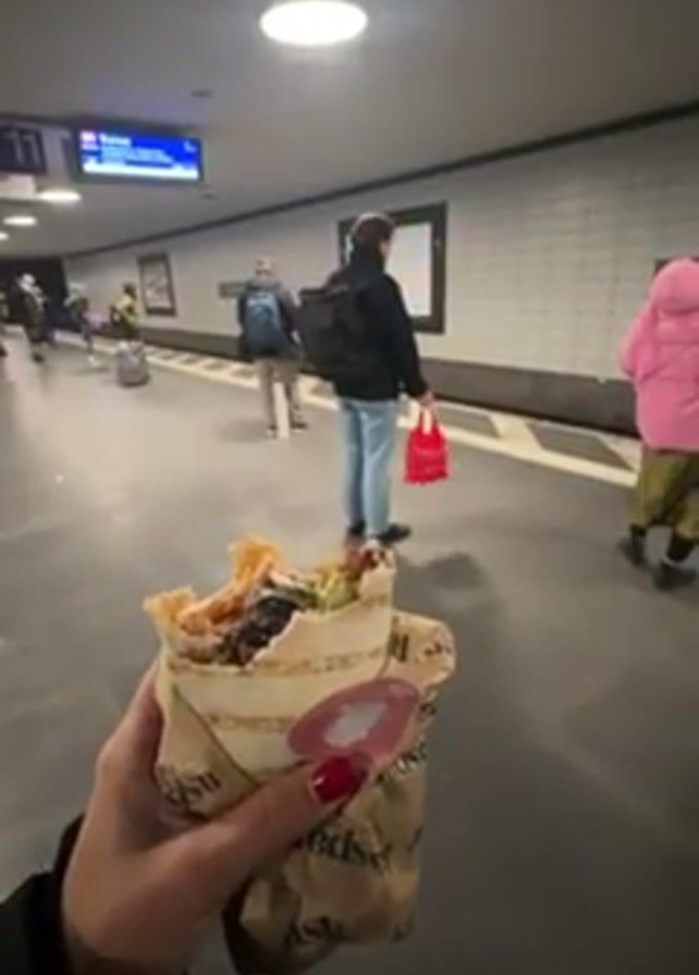 person standing on a subway platform. The person is holding a half-eaten wrap in their hand. The wrap is wrapped in brown paper. Several other people are visible on the platform, waiting for a train. The subway station has white-tiled walls and a dark floor. A sign indicates "11" above. The video gives the impression of someone grabbing a quick bite while waiting for a train.