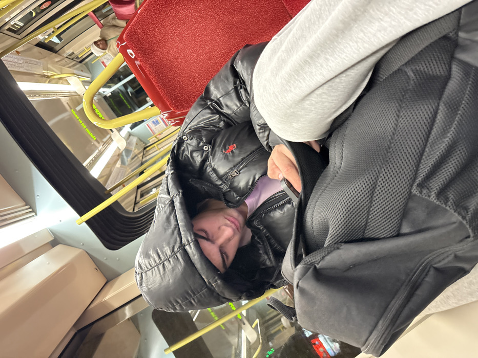 A person with closed eyes, possibly sleeping, sits on public transport. They wear a black, puffy hooded jacket. A gray sweatshirt sleeve is visible near their neck. A black backpack is positioned close to them. The surrounding environment includes yellow poles and a red chair, indicating a bus or train interior. The image is angled, possibly taken by the person.