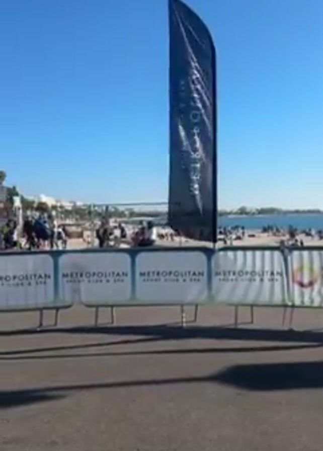 several people running a race on a sunny day. The camera is focused on the race course. In the background is a beach with people and a cityscape. The runners pass by a metal barricade with sponsor logos on it. There are also tall flags with advertisements on them. Some spectators are on the beach and along the side of the road.