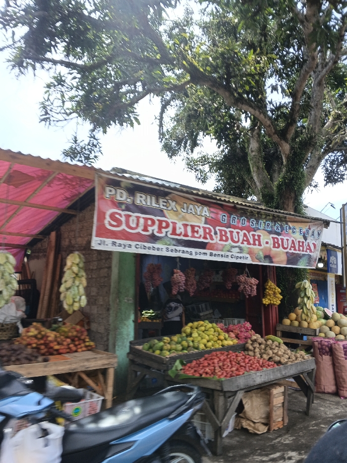 A roadside fruit stand, "PD. RILEX JAYA GROSIR&ECERAN SUPPLIER BUAH-BUAHAN," displays a variety of fruits. Strings of produce hang from the stall's edge. Baskets and tables showcase pineapples, rambutans, and other colorful fruits. A motorbike is parked in front of the stand. The stall is located on Jl. Raya Cibeber, across from the Cipetir gas station, beneath a large tree. A red tarp covers the roof of the small shop.