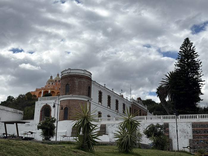 A sprawling, white-walled building with a round brick tower stands on a hill under a cloudy sky