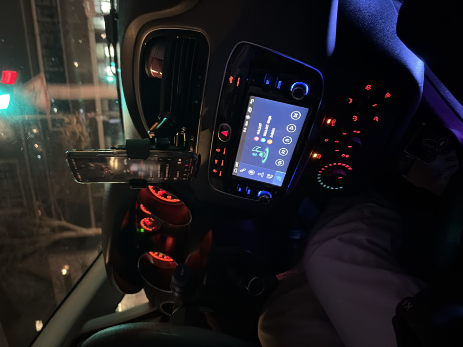 Inside a car at night, the dashboard glows with lights. A phone mounted on the dashboard reflects city lights. The car's infotainment system displays music information. Climate control buttons and dials are visible, illuminated in red and green. A person wearing light-colored pants sits in the driver's seat. The overall atmosphere is dark with bursts of light from the car's interior and the outside environment.
