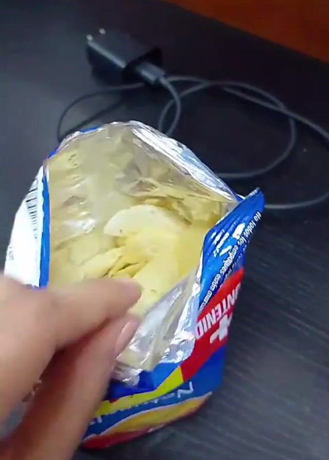 Here is a forensic description of the video: A hand reaches into an opened bag of potato chips
